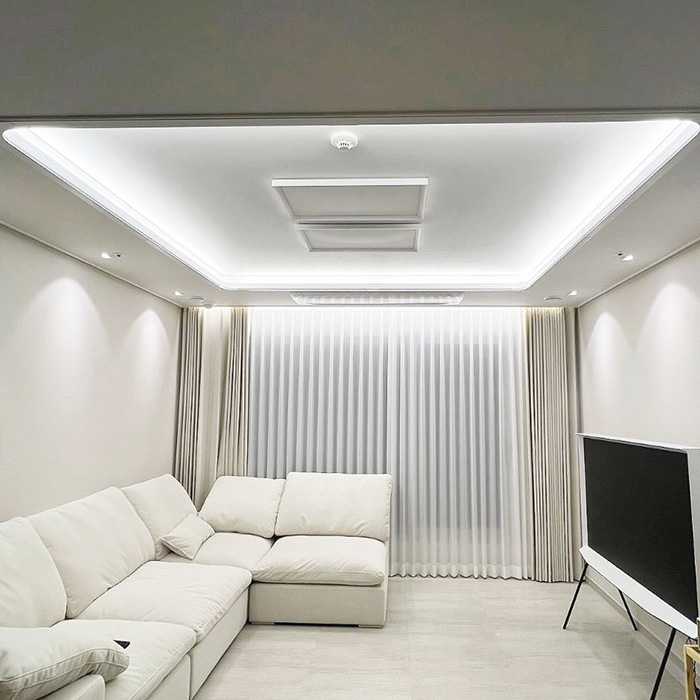 우물천장 간접등(목공/PVC/무몰딩) + COB간접등 8개 + 커튼박스 간접등 +